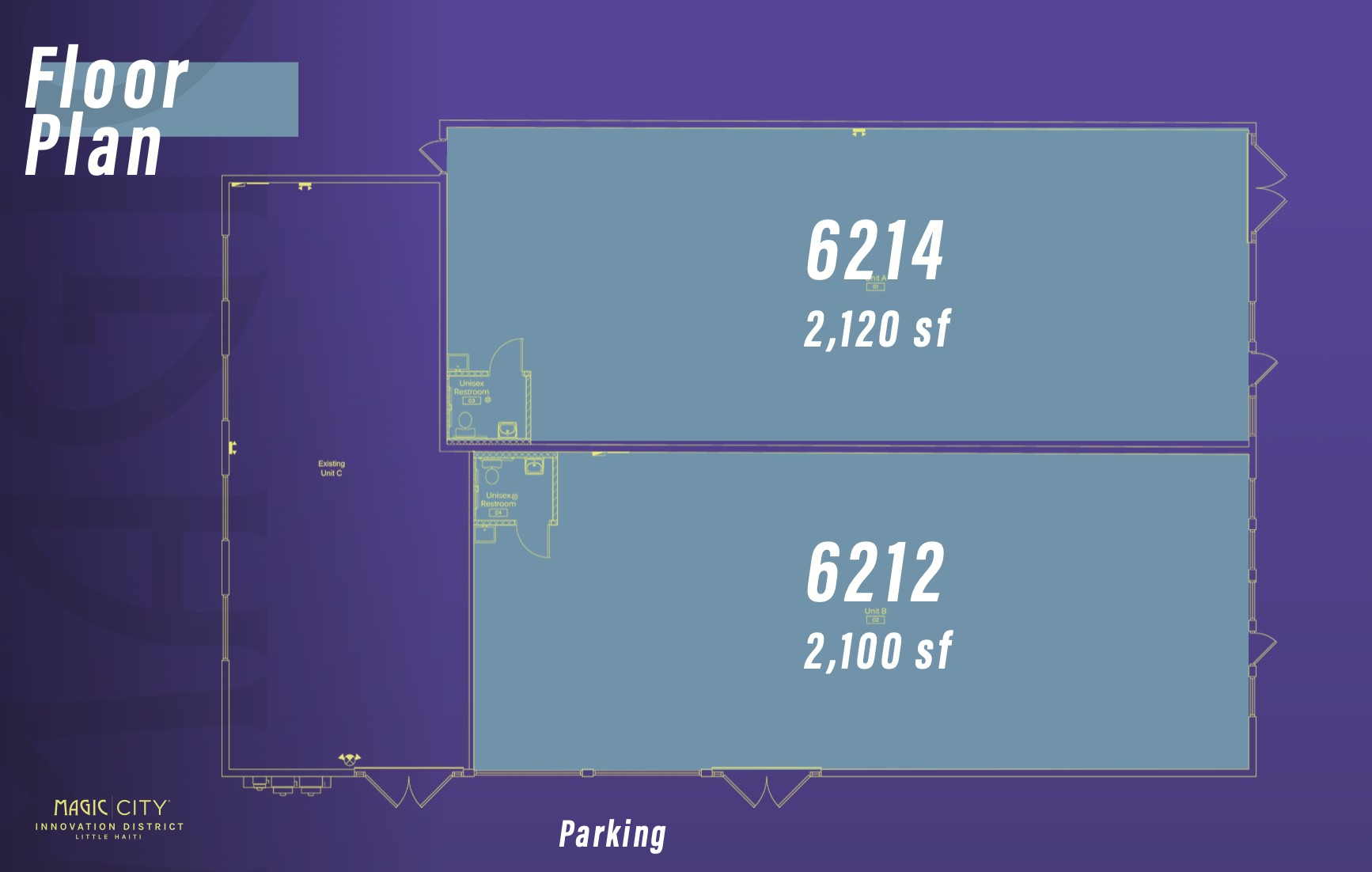 6212 NE 4th Ct offers 2,100 SF of space at the eastbound edge of the Magic City Innovation District, situated at the corner of NE 4th Ct and 62nd St. 6214 NE 4th Ct provides an additional 2,120 SF in the same building.