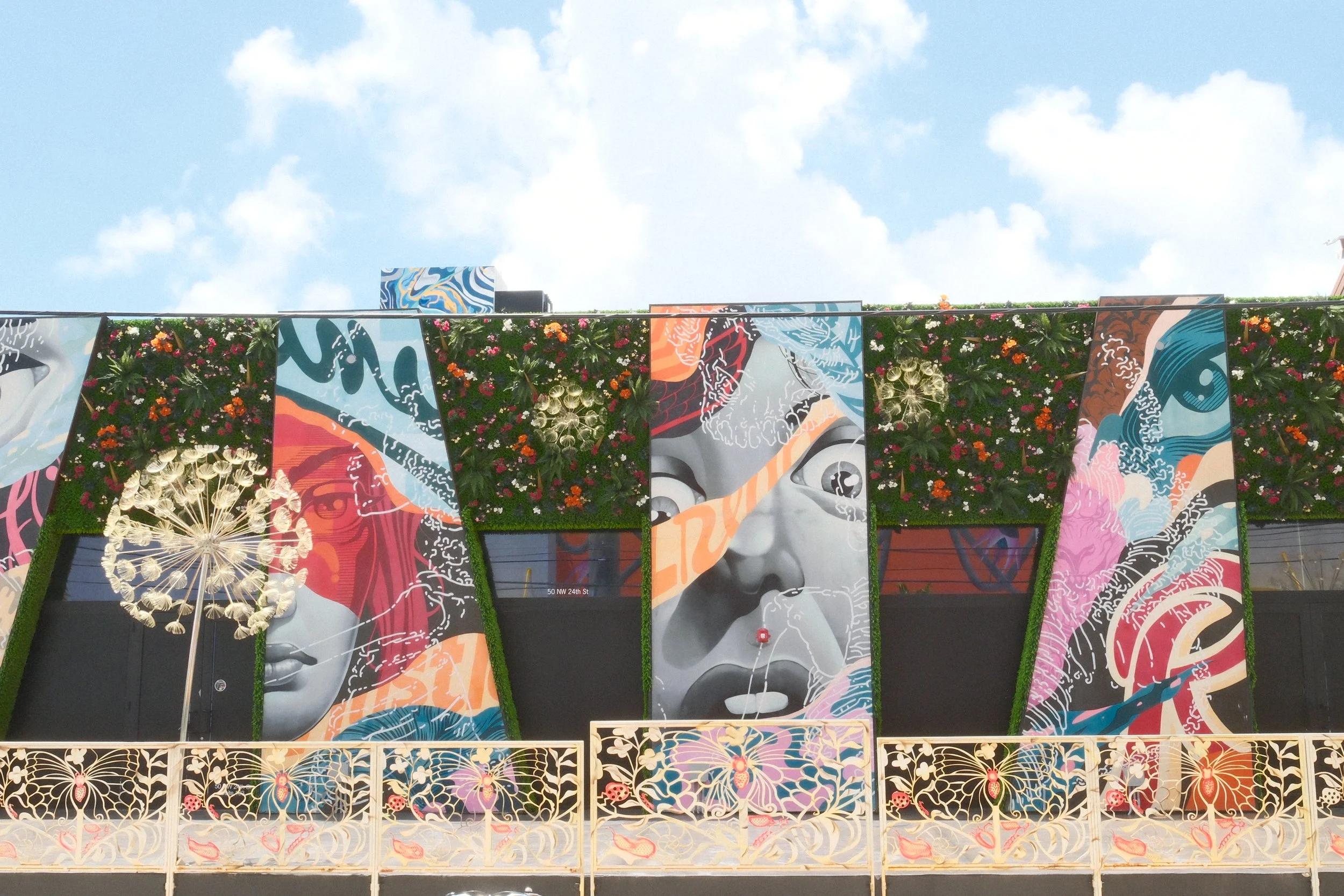 The property features a grand facade facing NW 24 Street, filled with a lush landscape and a mural by world renowned artist Tristan Eaton, as well as outdoor seating right in front of the space.